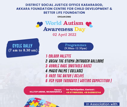 The world autism awareness day was celebrated by Akkara Foundation. This event was organized by District Social Justice Office Kasaragod. As a part of it to conducted cycle rally was inaugurated by AJITH KUMAR (CI, KASARAGOD). As part of this, cultural program was conducted and its inauguration was officiated by Hon’ble C KRISHNA KUMAR (Principle District and Session Judge, Kasaragod). 80 people were participated in the event. Chief gust of this event ADV.V M MUNEER (Chairperson, Kasaragod Municipality). Special gust of this event MARWAAN MUNAAARM (Nobel World Record winner- “world’s first autism person to act and sing in a professional music album). Presidential address was given by Mrs. SHEEBA MUMTHAS (Social Justice Officer, Kasaragod) and facilitation was given by Mr.BIJU (District Probation Officer), FATHER JOSE (Director, Navajeevan Special school). MOHANDAS (Founder, Better Life Foundation) said the vote of thanks at the event. As a part of it conducted indoor games for children. Once @helenofsparta_official (Instagram fame) joined with us on the occasion of world Autism awareness day at Hill top Arena.